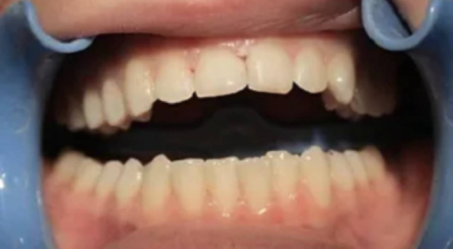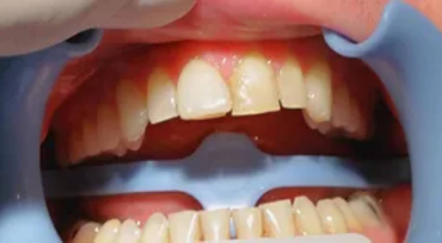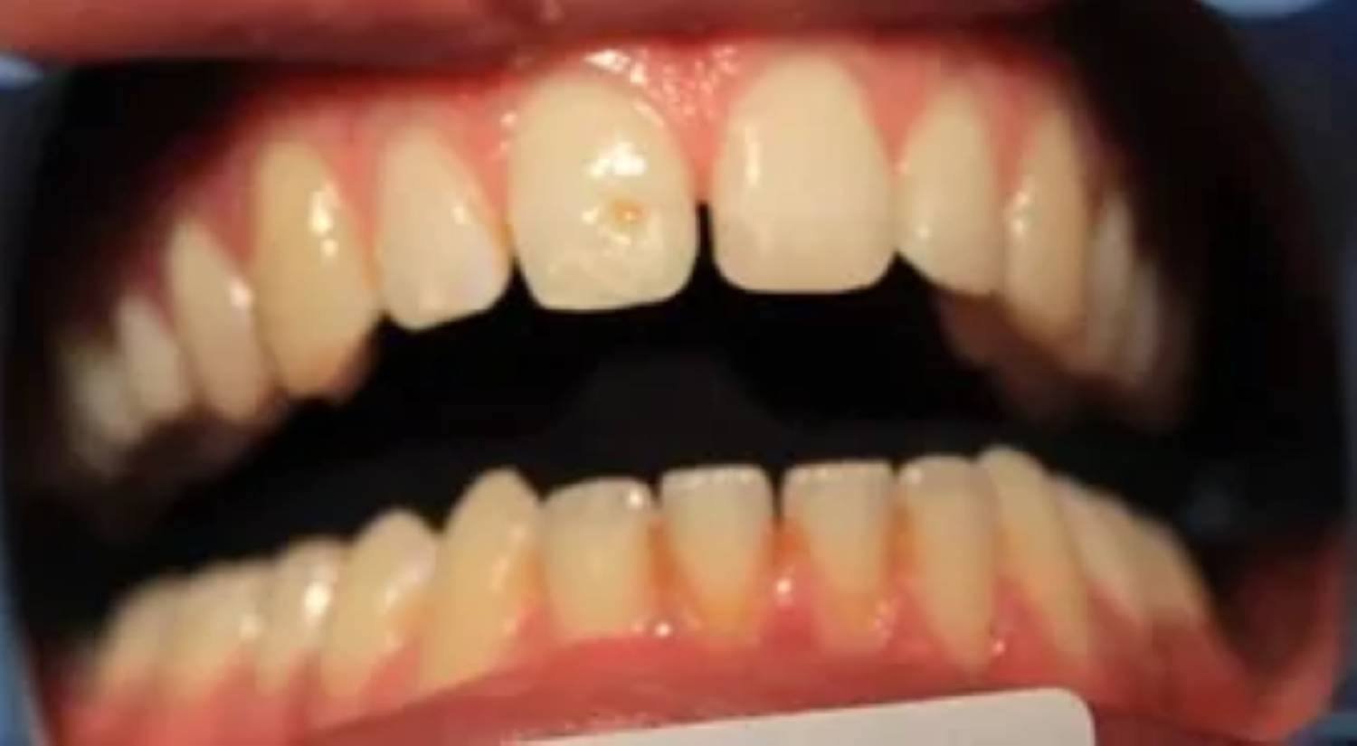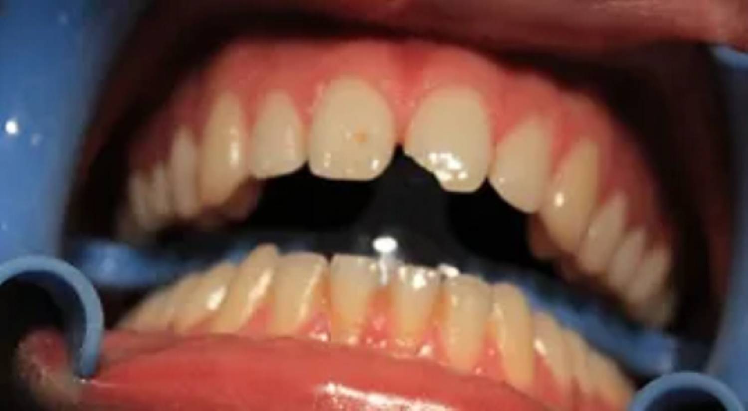 Due to trauma, there was an anterior enamel fracture on the upper left central incisor and a chip to upper right old composite build up on the upper right central incisor.