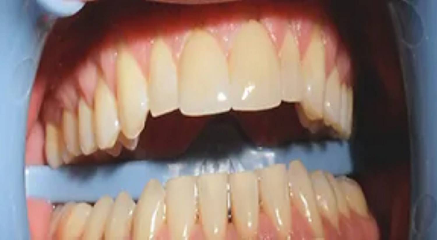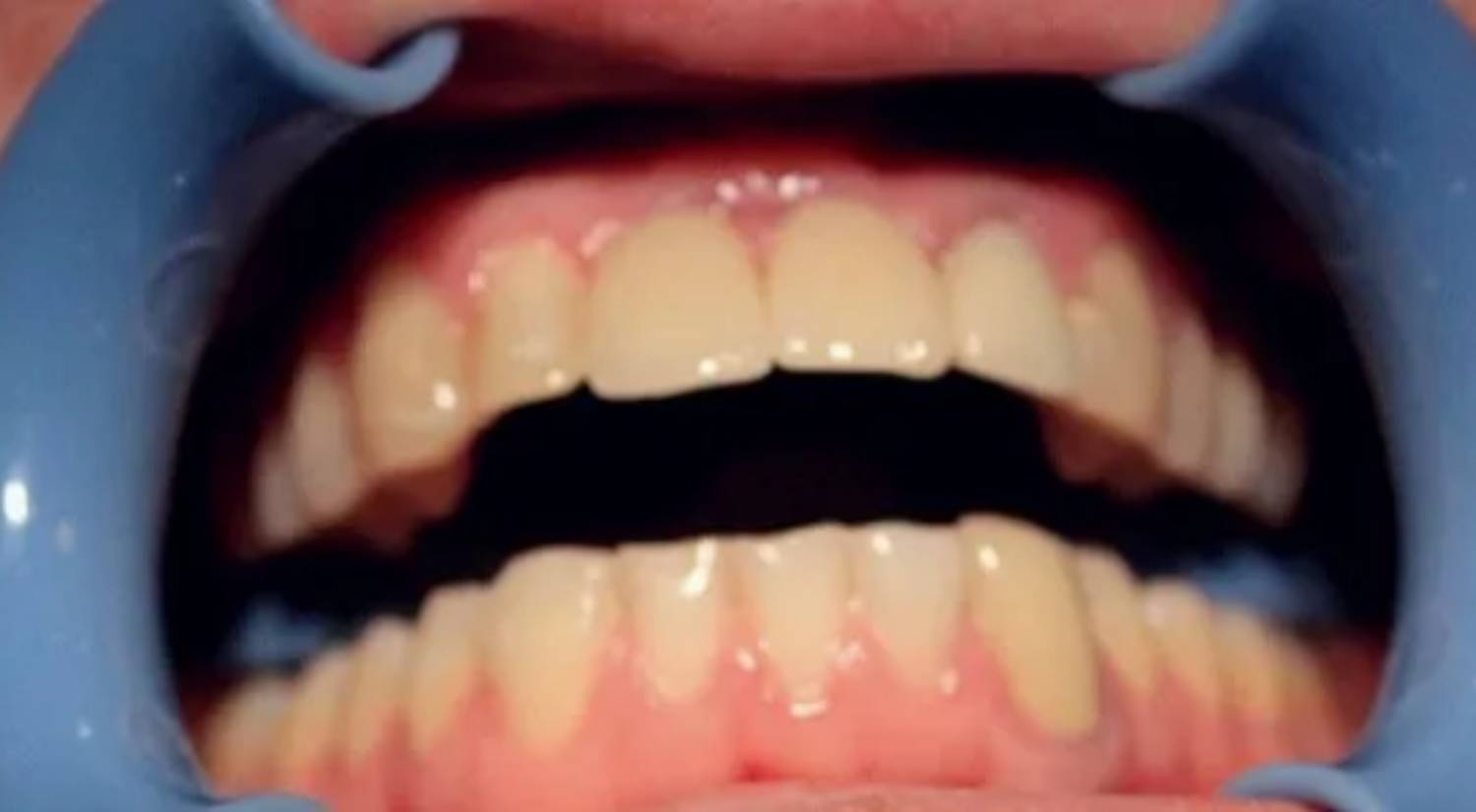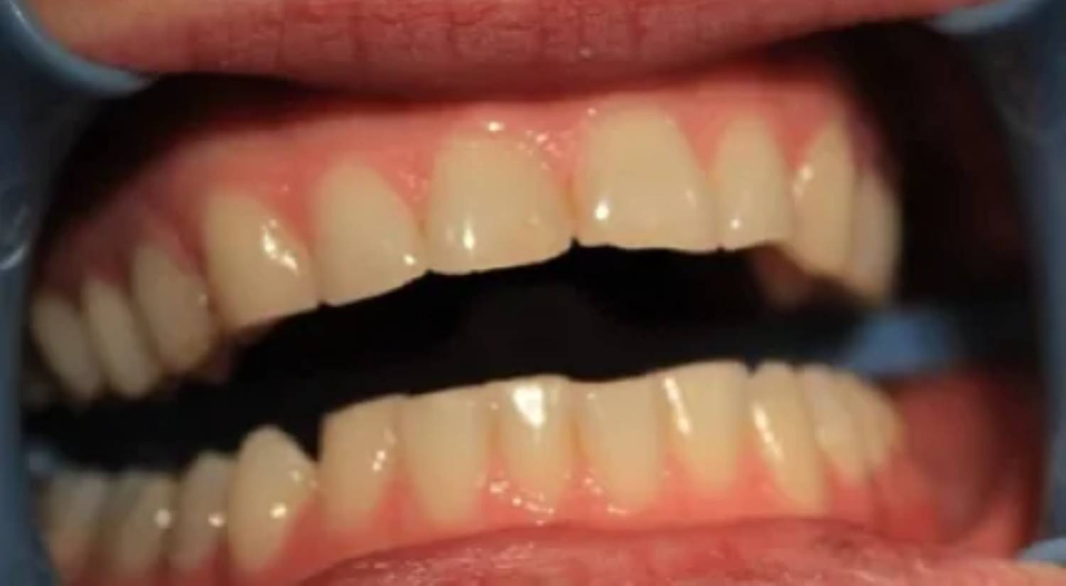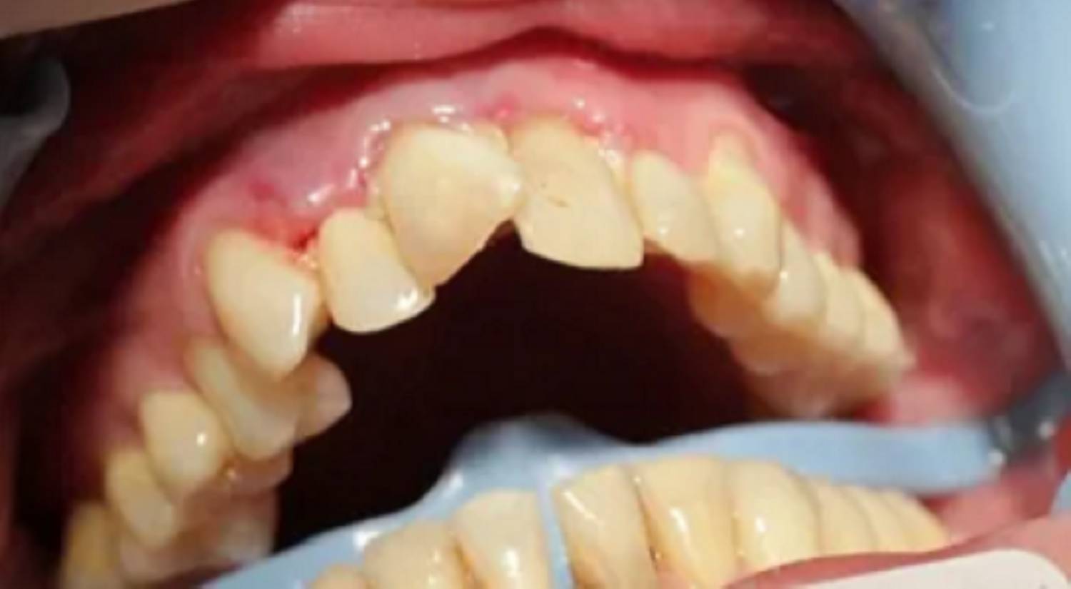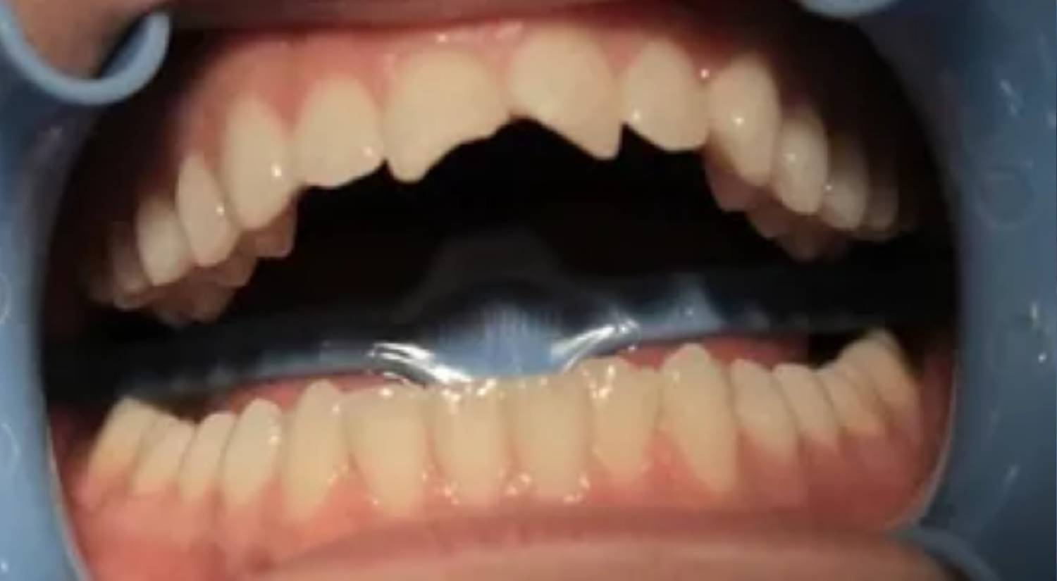 Due to trauma, there was an anterior enamel fracture on the upper left central incisor and a chip to upper right old composite build up on the upper right central incisor.