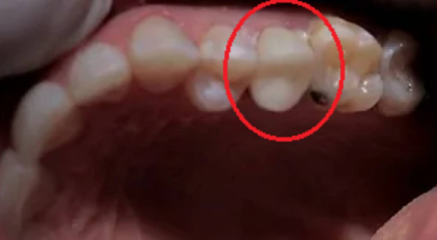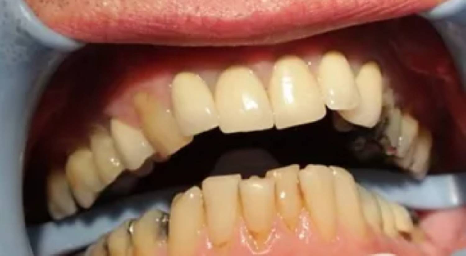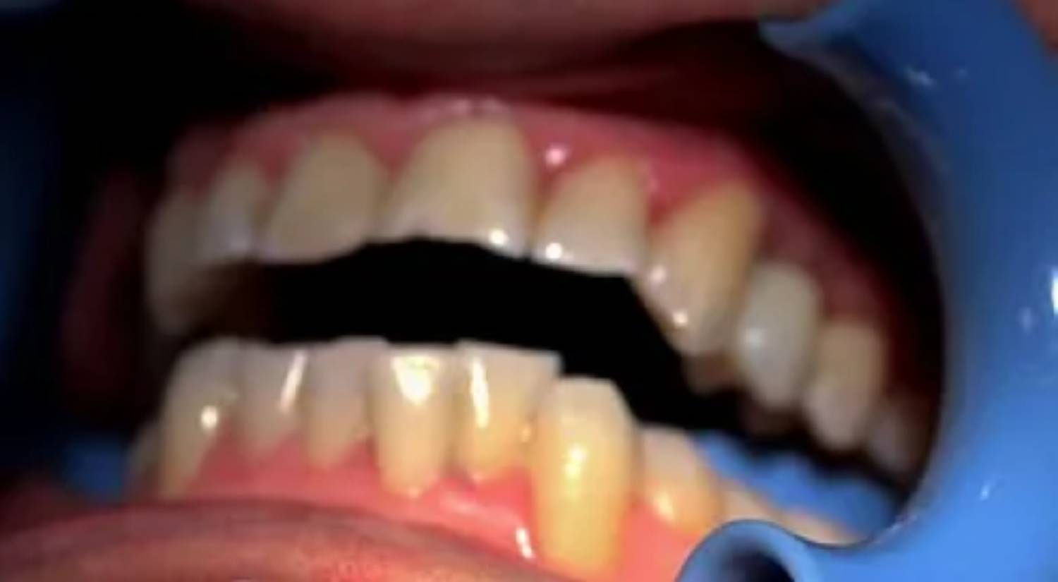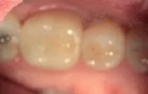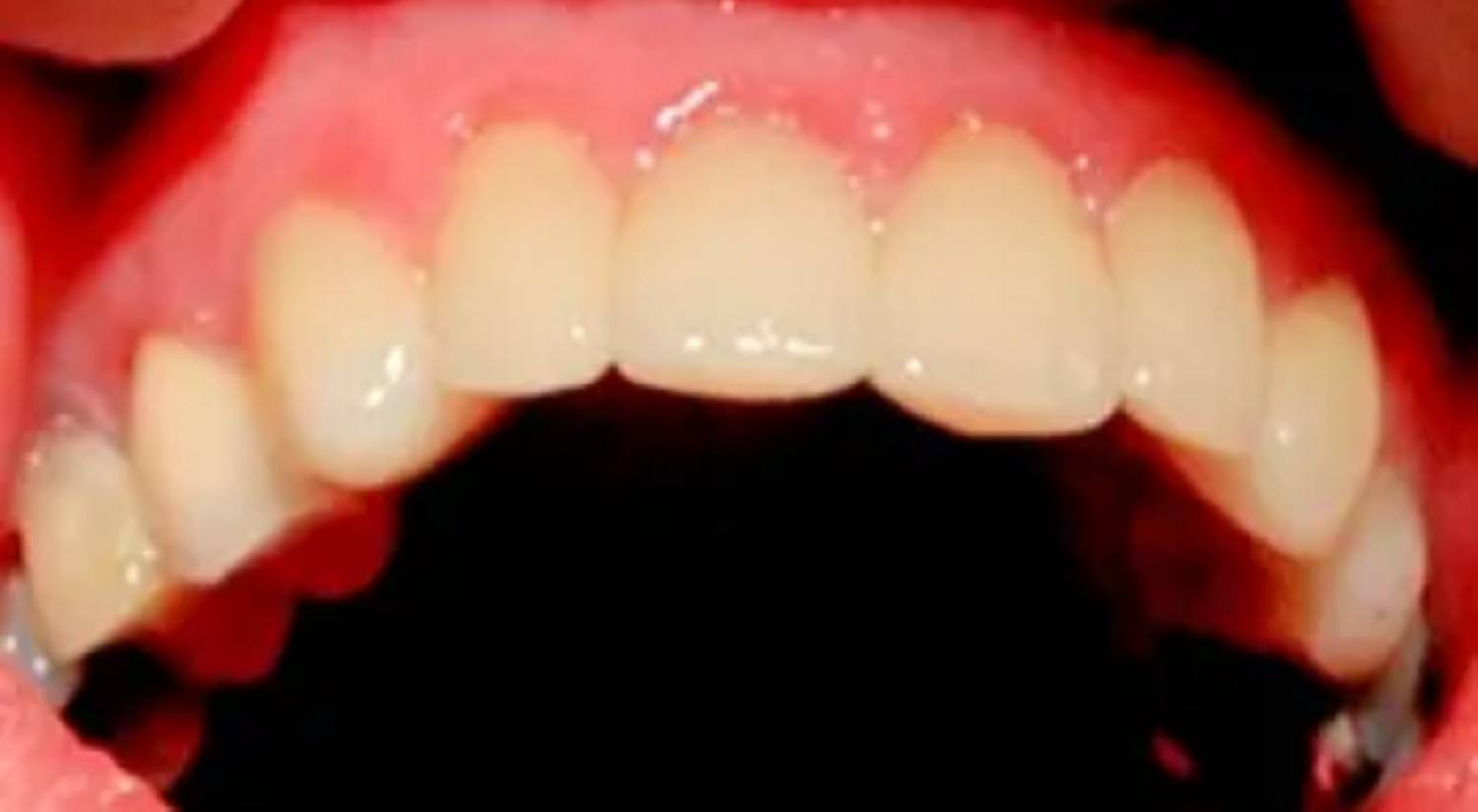 Due to trauma, there was an anterior enamel fracture on the upper left central incisor and a chip to upper right old composite build up on the upper right central incisor.