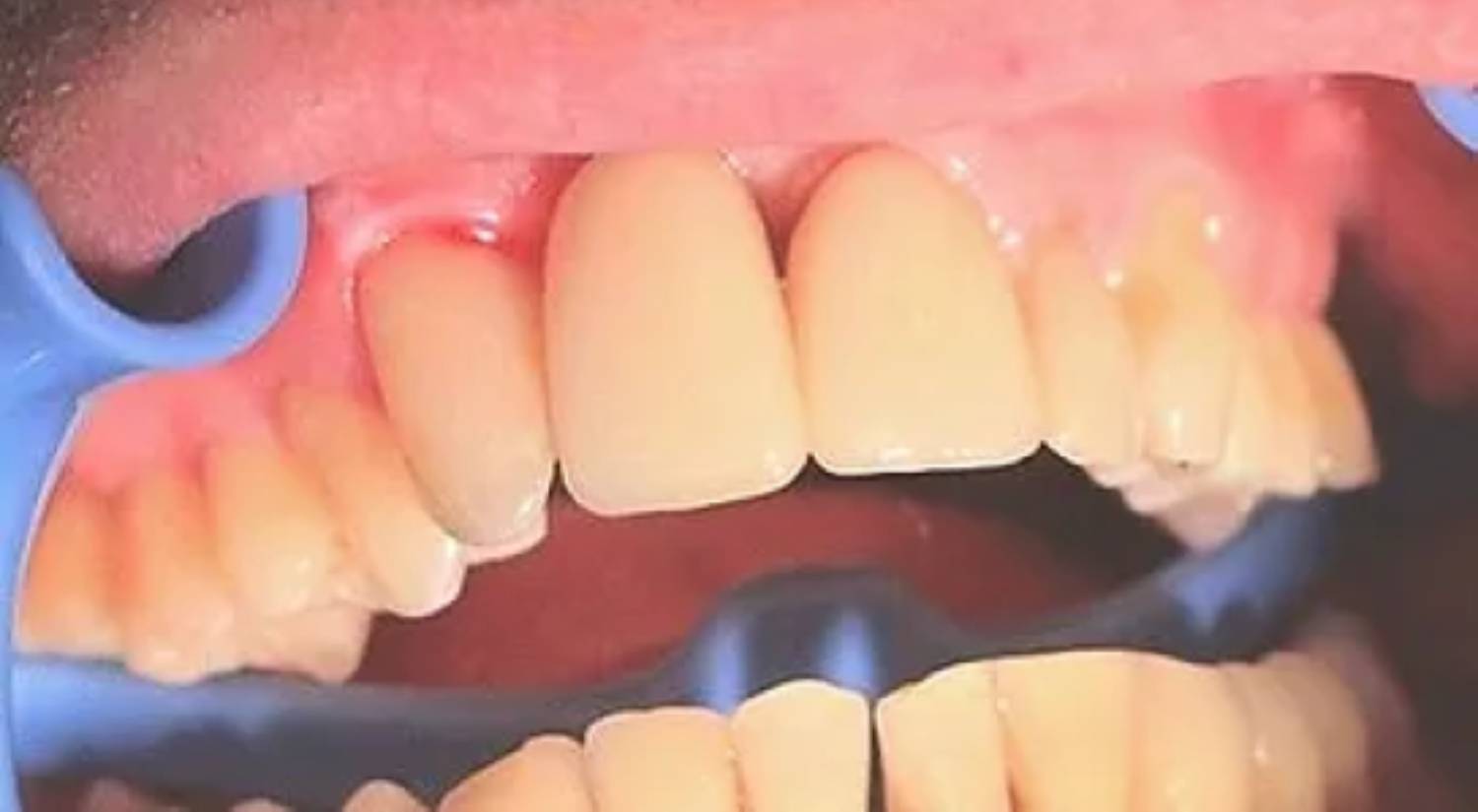 Trauma fractured the anterior front left tooth. This was improved by anterior composite white filling restoration treatment on the upper left front central incisor.